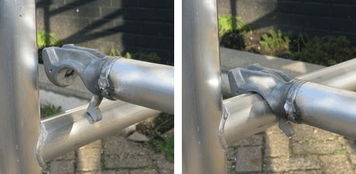 De stabilisator wordt aan het frame bevestigd met een kunststof koppeling, deze is makkelijk in gebruik en brengt geen beschadiging aan het frame toe. Is verplicht bij een werkhoogte vanaf 6.00 m bij een brede steiger, en vanaf 4.00 m bij een smalle steiger. Klik hier om de werking van het klauwtje te zien